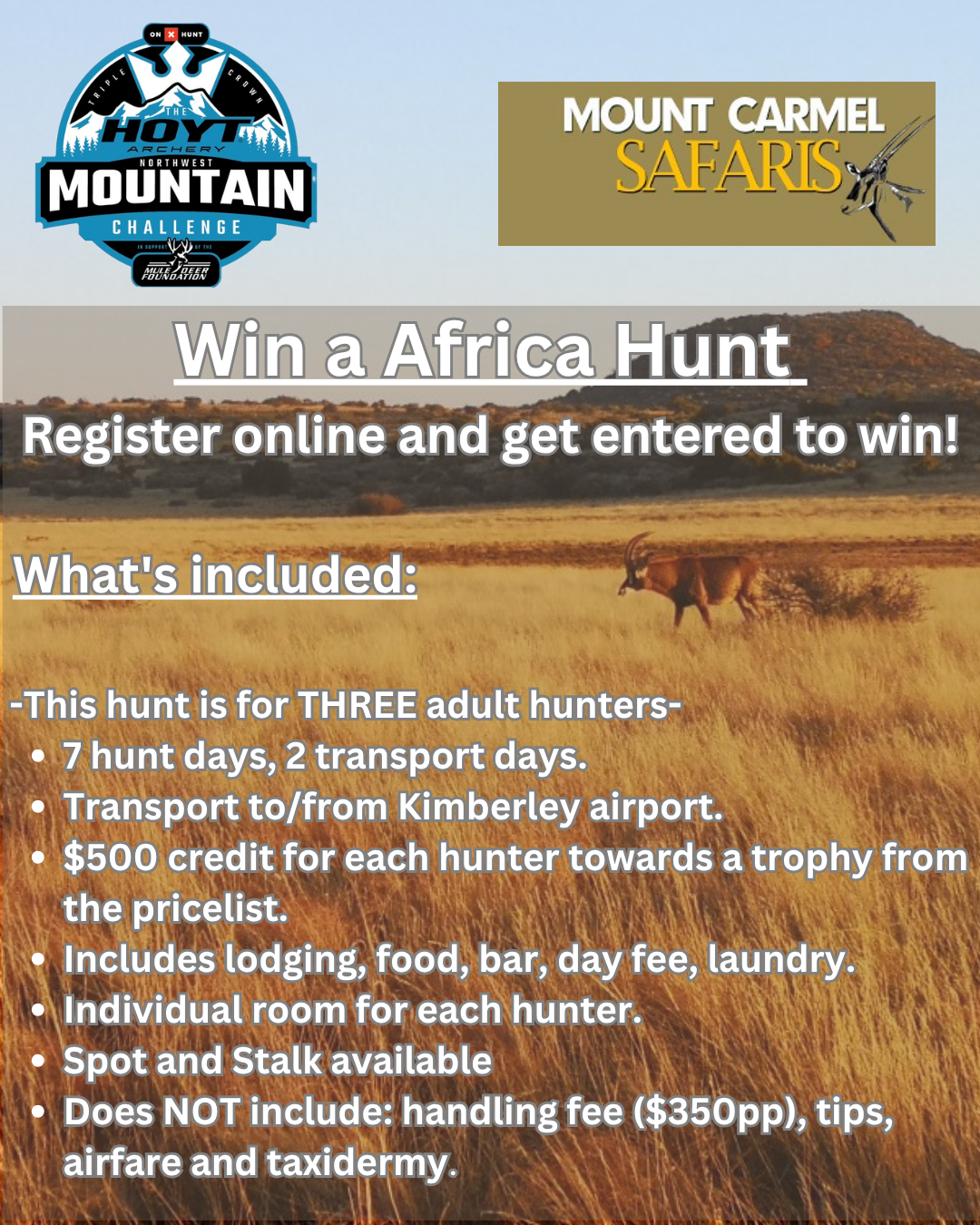 For 2026, we are excited to announce that we have partnered up with Mount Carmel Safari's. You're automatically entered to win the Africa hunt just by registering for any of our events. Every event you enter counts as an entry!